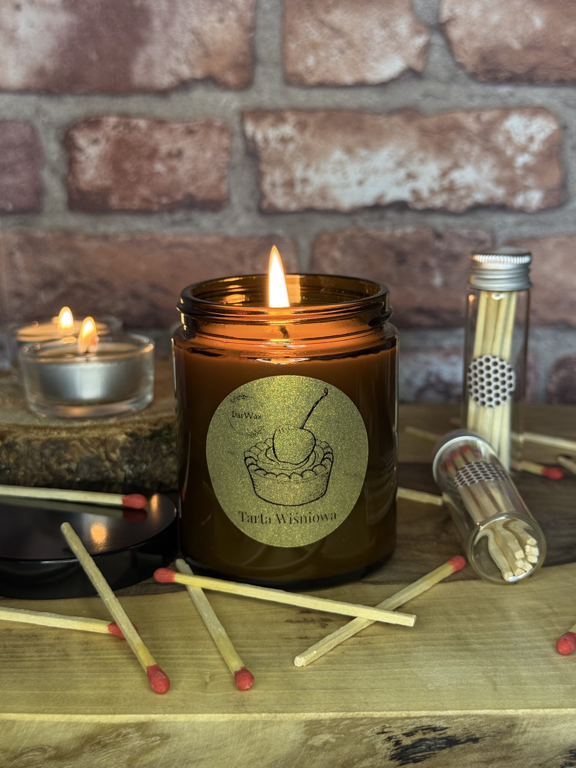 Tarta wiśniowa – świecę sojową o tym zapachu o pojemności 180 ml wykonujemy ręcznie w naszej manufakturze z naturalnego wosku sojowego.